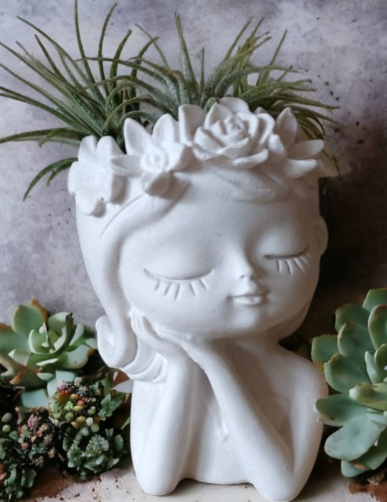 مزهرية كونكريت على شكل وجه من متجر لمسة فن تضيف لمسة حالمة لديكور منزلك. تبرز فتاة ناعمة الأوجه مع زهور محيطة برأسها. صناعة يدوية فريدة مع إمكانية تلوين حسب طلبكِ.